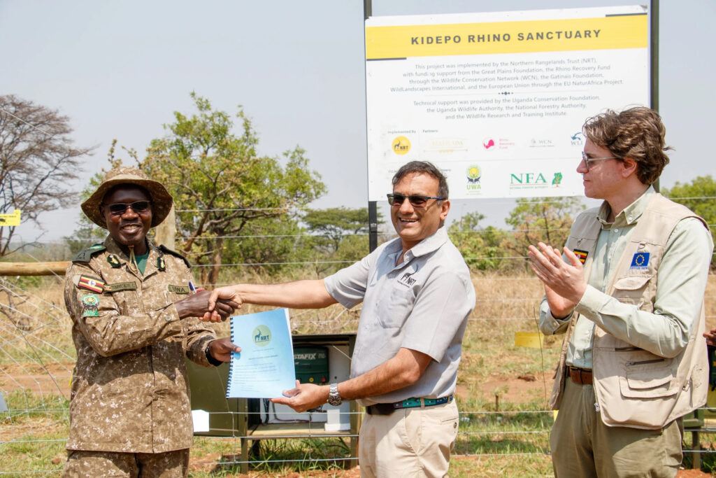 The handover ceremony saw Vishal Shah, Chief Executive Officer of Northern Rangelands Trust, present the project completion report to Charles Tumwesigye, Commissioner of Field Operations at the Uganda Wildlife Authority.