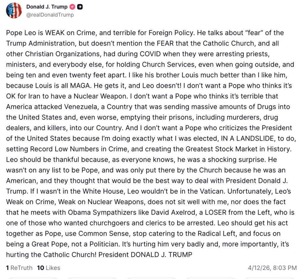 U.S. President Donald Trump ignited fresh controversy on April 12, 2026, after publishing a lengthy and sharply worded post on Truth Social attacking Pope Leo XIV.