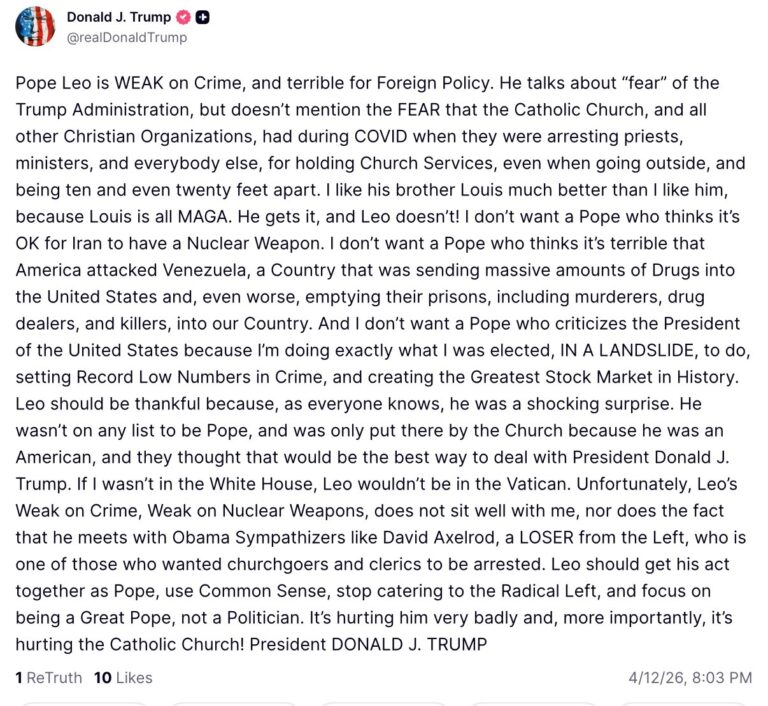 Trump Targets Pope Leo XIV in Fiery Late-Night Post U.S. President Donald Trump ignited fresh controversy on April 12, 2026, after publishing a lengthy and sharply worded post on Truth Social attacking Pope Leo XIV. Posted at 8:03 PM, the message delivered a deeply personal critique of the pontiff, marking one of the most direct … Continue reading Trump Launches Scathing Attack on Pope Leo XIV in Explosive Truth Social Post